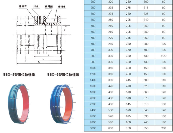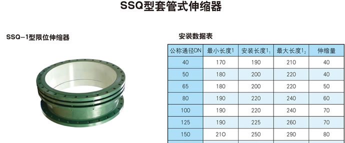 SSQ型套管伸缩器说明: 1、该系列产品为各种给排水管道、水塔水泵,水表、阀门的安装拆换提供了方便.给长距离管路因温差引起的伸缩起到了很好的调节作用。 2、安装前须松开压盘螺栓.将该器拉至安装长度,然后用对角法拧紧,切勿压偏.如架空使用两端须安装相应的固定支架。
